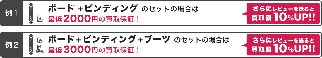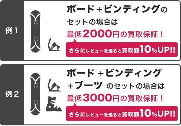 対象はメーカーがNEWモデルとして新品販売してから5年以内のボード・ビンディング・ブーツのみになります。ウェアーやアクセサリー類はボード・ビンディング・ブーツに同梱発送の場合に限り買取いたします。