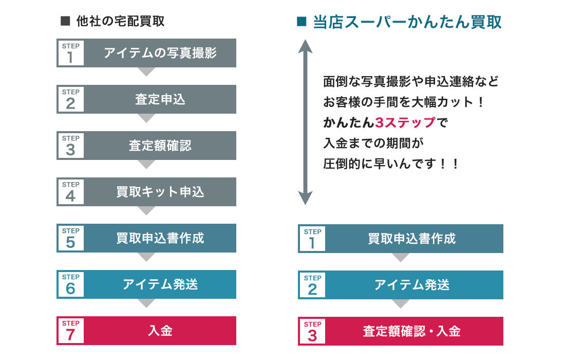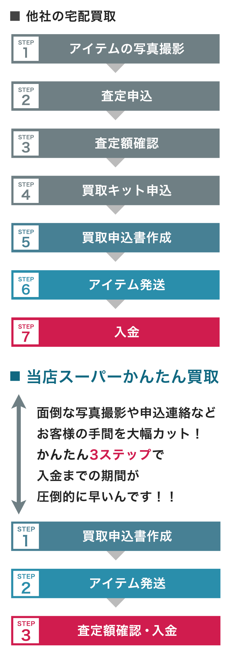 - 古物営業法に基づき査定申し込みの際は、本人確認書類とご指定口座のお名前が一致しない場合は買取ができません。